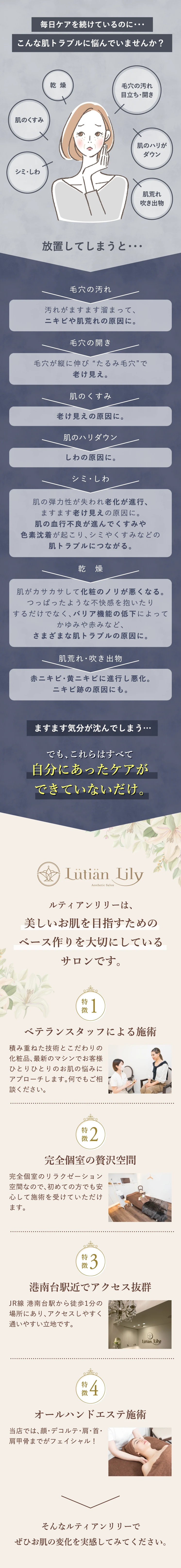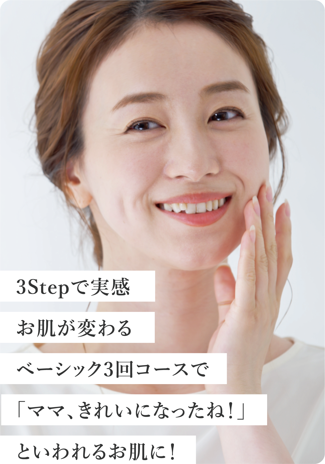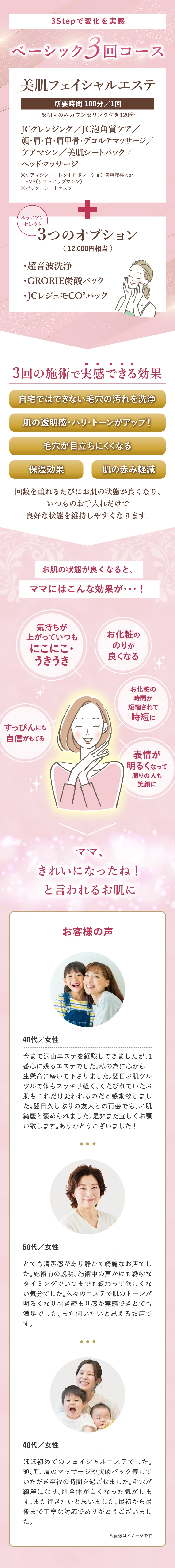なぜ3回コースなのですか?1回で効果はでないのでしょうか。 当サロンは、肌のターンオーバーを整え、美肌を目指す土台づくりを大切にしています。肌のターンオーバーは約28日周期のため、2週間に1回のペースで続けることが、美肌への近道です。2週間に1回の施術×3回の一か月半のコースとなり、3つのステップを進むたびにお肌は徐々に変化します。1回の施術よりも、3ステップでその効果をより実感していただけますので、まずは3回コースをおすすめしております。